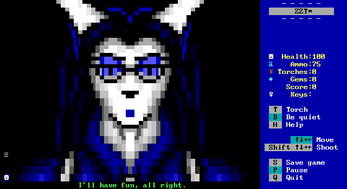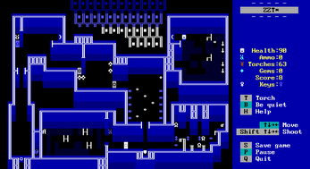 Now the second issue with controls is in the menu of the game. I guess it's a limitation of the used engine but the way you have to firt press P to start the game and then use your game avatar to move on the menu spot to start the actual game is rather counterintuitive. I'm not familiar with other games in ZZT but trying to figure this the first time made me a bit confused.